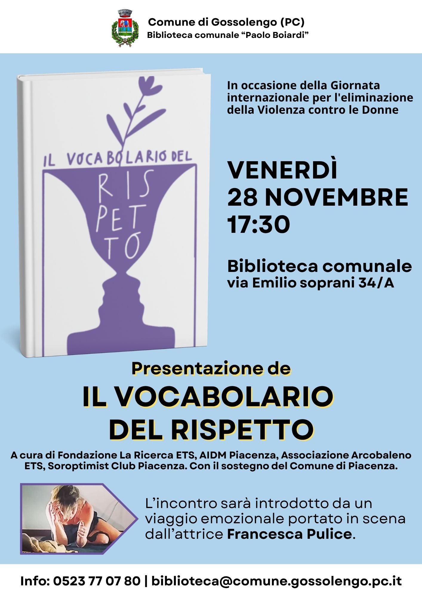 Iniziativa  contro la violenza di genere  e presentazione del Vocabolario del Rispetto   a cura di Fondazione La Ricerca, AIDM Piacenza, Associazione Arcobaleno, Soroptmist Club Piacenza e col sostegno del Comune di Piacenza.
